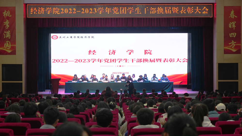 为进一步加强学生干部队伍建设,增强党团学组织的凝聚力,更好地推动经济学院学生工作的有序开展,11月23日,经济学院2022-2023学年党团学生干部换届暨表彰大会在学术报告厅顺利召开。学院院长马润平、教学院长胡瑜杰、行政院长秦勇、教学副院长李互武、教学院长助理王红娟、行政院长助理陆海峰出席大会,办公室主任马晓天、团总支书记孙文芸、党政秘书邓超、全体辅导员老师及学院党团学生干部、各班级学生代表共计800余人参加了大会,会议由党委书记周欣主持。