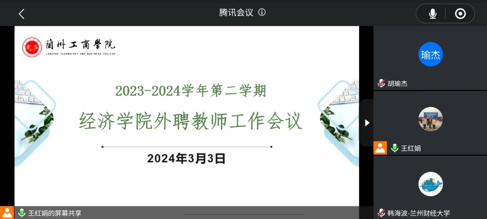 3月3日下午,学院召开新学期外聘教师工作会议,教学院长胡瑜杰、教学副院长李互武、教学院长助理王红娟及本学期经济学院所有外聘教师参加,会议以腾讯线上会议形式召开。会上,首先由教学院长助理王红娟对本学期教师上课纪律,课堂要求进行强调,并详细说明了课程过程性考核相关文件要求及教学日志填写规范。最后,教学副院长李互武依照《兰州工商学院课程学习手册使用及管理暂行办法》,对外聘教师进行课程学习手册使用培训。