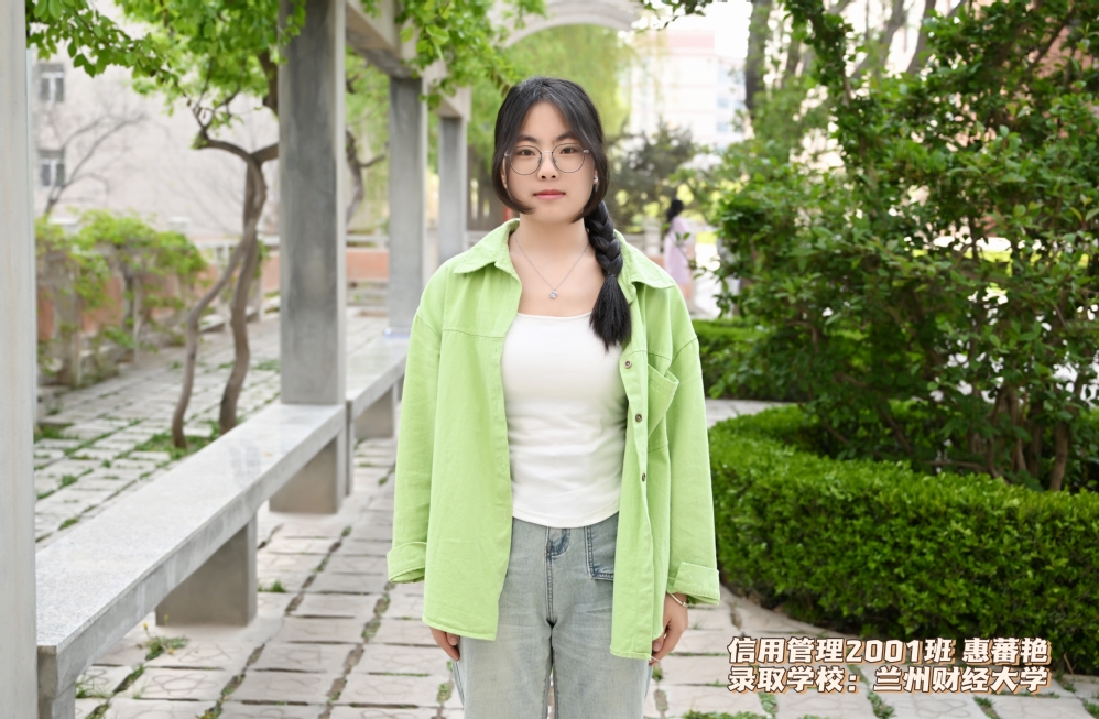 惠蕃艳,女,甘肃庆阳人,共青团员,信用管理2001班学生。该生学习认真,成绩优秀,在校期间考取了计算机二级证书、大学英语四六级证书、普通话证书。荣获2020-2021学年国家励志奖学金、校级“三好学生”、团学工作“先进个人”荣誉称号;2021-2022学年国家励志奖学金、“东方财富杯”校赛一等奖、全国优胜奖;2022-2023学年“学习优秀二等奖”“四星级文明宿舍奖”荣誉称号、“天天基金杯”校赛一等奖、“兰州工商学院优秀毕业生”称号。通过自己的刻苦学习,2024年考取兰州财经大学农村发展专业硕士研究生。惠蕃艳同学分析自己成功上岸的原因,有以下三点:首先要目标明确,朝自己想要的东西努力;二是灵活制定复习计划,并持之以恒的坚持下去;三是要有一个稳定的心态,心态崩了可以找同学老师倾诉或者给自己适当放假。
