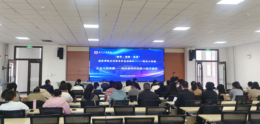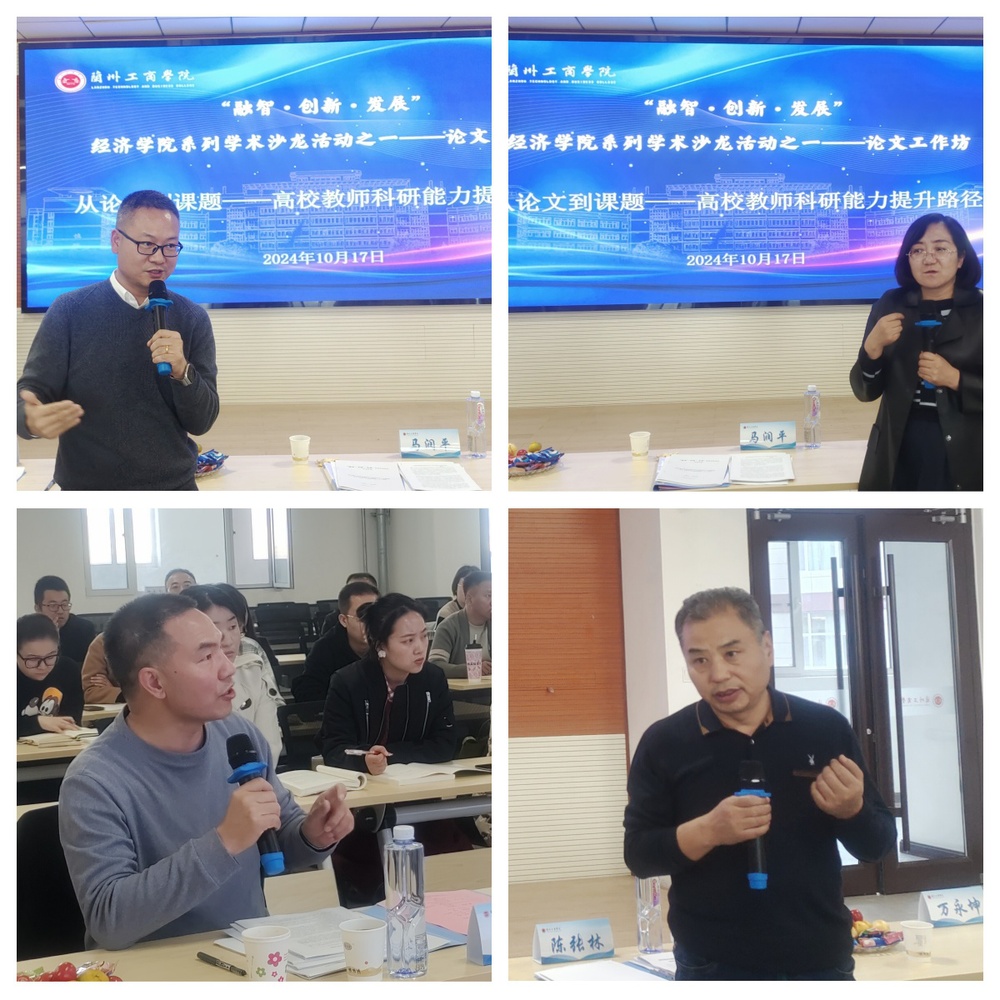 为提升我院青年教师学术科研能力,搭建学术交流平台,10月17日下午在综合教学楼C501教室举行“融智•创新•发展”学术沙龙系列活动之一—论文工作坊。本次活动以“从论文到课题——高校教师科研能力提升路径”为主题,聚焦理论前沿、学科动态、最新研究方法和论文打磨,不断提升青年教师科研能力。活动邀请了兰州大学经济学院范巧教授、兰州财经大学经济学院院长刘建国教授、甘肃省科学技术情报研究所副所长张小宁研究员、甘肃省社会科学院《开发研究》编辑部主编鲁雪峰、兰州财经大学学报编辑部副主任陈张林,对学院6位青年教师的学术论文进行指导。活动由经济学院教学院长万永坤教授主持,兰州工商学院副校长、经济学院院长马润平教授出席活动,学院全体教师参加。