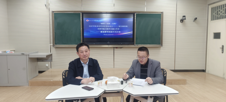 为了更好地迎接本科教学工作合格评估,加快对青年教师教育教学能力的培养,提高课堂教学质量,10月31日下午在实验楼录播教室举办“融智•创新•发展”学术沙龙系列活动之二——以“课堂教学的技巧与方法”为主题的青年教师教育教学能力提升工作坊,由经济学院教学副院长李互武主持。活动邀请了学院银龄教师潘明星教授,为教龄不满5年的青年教师就课堂教学组织、课堂互动技巧、学生学习动机激发等方面进行了深入讲解和示范。潘教授结合自己丰富的教学经验,分享了实用的教学策略,并通过案例分析的方式,让青年教师们对如何组织课堂教学有了更深刻的理解。
