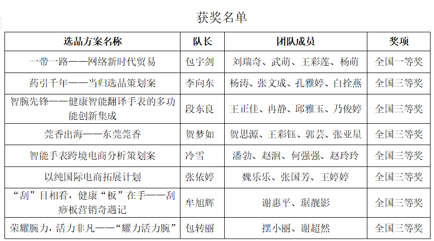 我院在校赛中共报名108人,24支参赛队,108人全部通过知识赛,校赛后推荐12支队伍参加全国预选赛,经过激烈角逐,我校共有9支队伍晋级全国总决赛。 在全国总决赛中,我院获奖队伍凭借优秀选品方案和出色的直播营销技巧展示,得到了一致好评。特别是“一带一路——网络新时代贸易”的选品方案凭借其独特的选品理念,新颖的营销方案,精彩的直播视频成功获得了总决赛一等奖,并被推送至全国精英赛。