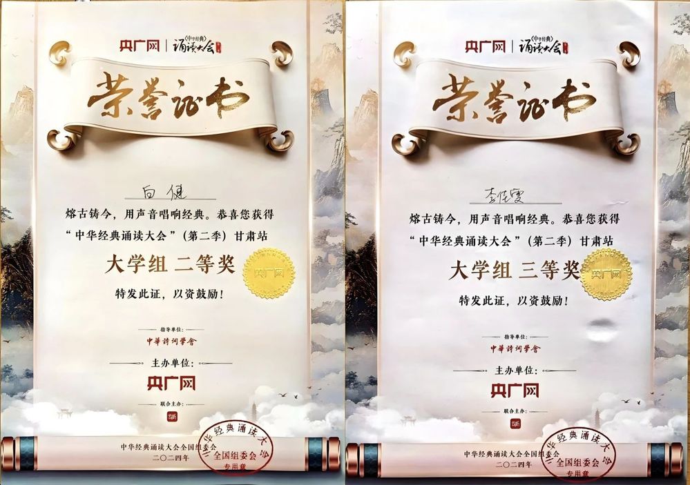 近日,在中央广播电视总台央广网独家策划的大型文化展演活动——“中华经典诵读大会”(第二季)甘肃站作品征集海选中,经济学院学子凭借出色的表现,在此次作品评选中取得了二等奖一项,三等奖一项的优异成绩