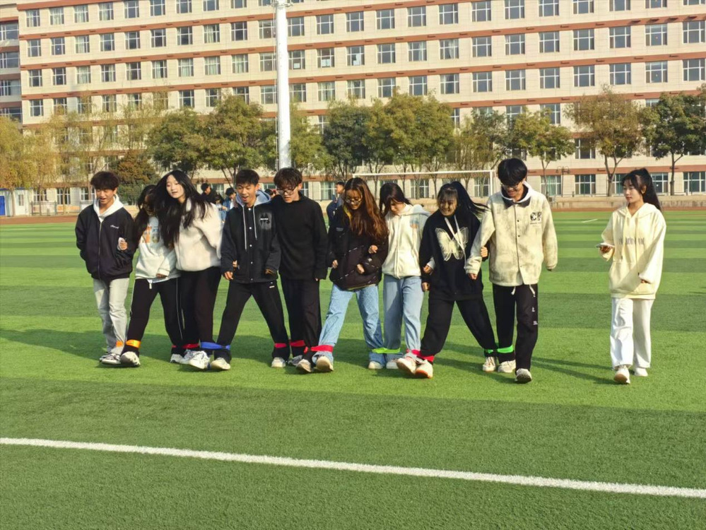 在“N人N足”游戏中,队员们两两相邻,将各自靠近的腿用绑带紧紧绑在一起,瞬间化身为紧密相连的整体。随着一声响亮的哨声,比赛正式拉开帷幕。“一二、一二……”各队喊着整齐有力的口号,步伐协调一致地朝着前方迈进。同学们肩并肩、脚绑脚,齐心协力地朝着目标迈进,口号声高亢嘹亮,整齐的步伐彰显着大家的决心,团队精神熠熠生辉。