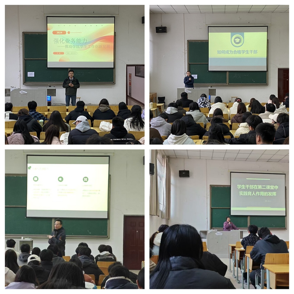 在培训课程设置方面,培训班紧密结合学生干部工作实际,具有极强的针对性与实用性。分别通过《学生干部自我成长与提升》《新时代学生干部的使命与担当——做引领青年成长的先锋力量》、《学生干部在第二课堂中实践育人作用的发挥》《强化学生干部业务能力提升,助力学院学生工作创新发展》《如何成为合格学生干部》等几个模块进行了集中讲授,培训班接近尾声,安排了分组讨论和学生干部团建活动,这一活动有力地加强了学生干部之间的沟通与协作,极大地提升了团队凝聚力。