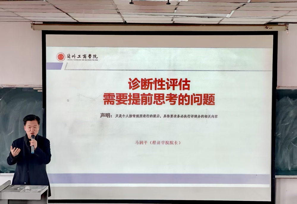 会议伊始,学校副校长、经济学院院长马润平围绕诊断性评估作专题讲解和工作部署。他通过主题PPT,深入剖析诊断性评估工作需提前思考的关键问题,重点强调需关注的七个核心方面,包括办学定位、师资建设、教学资源、学生发展等。马润平指出,诊断性评估是学院对标提升的重要契机,全院上下需从思想上高度重视、行动上高效落实,形成人人了解评估、人人参与评估、人人都是评估对象的迎评氛围。他要求,专任教师、辅导员及管理人员应立足岗位职责,协同推进教学规范、管理优化及特色凝练,确保评估工作与学院高质量发展同频共振。