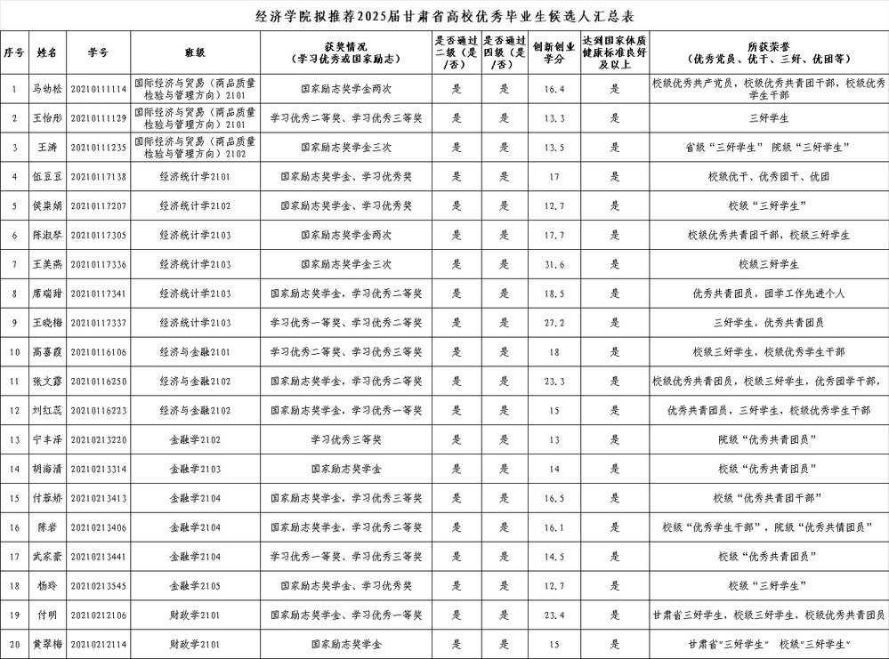 根据学校《关于做好2025届甘肃省普通高校优秀毕业生选拔工作的通知》文件精神,经学生本人申请,辅导员初审,学院评审,经学院会议研究,拟推荐国际经济与贸易(商品质量检验与管理方向)2101班马幼松等20名同学参加2025届甘肃省高校优秀毕业生评选。现将具体名单予以公示,公示期3天,接受广大师生监督。