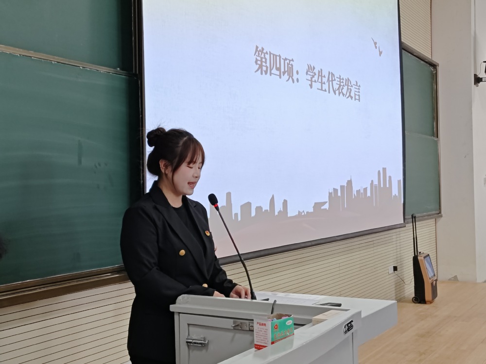邓超老师随后宣读活动文件,对本次读书活动的具体安排及赛事规则进行细致解读。他提及,活动精心设置丰厚奖励机制,从荣誉证书到实用奖品,激励同学们深度参与,在阅读中收获知识与成长。随后由学生代表王思瑶同学发言。她巧妙结合经济学原理,将书籍比作“精神资本”,以独特视角阐释阅读对个人成长的复利效应,引发全场共鸣。她还结合自身经验,分享碎片化阅读、主题式阅读等实用技巧,为同学们提供了高效阅读的 “方法论”。