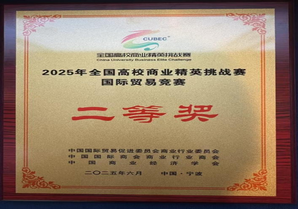 2025年6月6日至6月9日,为期四天的全国高校商业精英挑战赛国际贸易竞赛(国际贸易业务模拟赛道)总决赛在宁波圆满落幕。在此次竞赛中,由我院选派的代表队与武汉大学、大连海事大学、哈尔滨理工大学等高校同台竞技,斩获全国二等奖,充分展示了我院学子的创新思维和专业实践能力,为学院赢得了荣誉。
