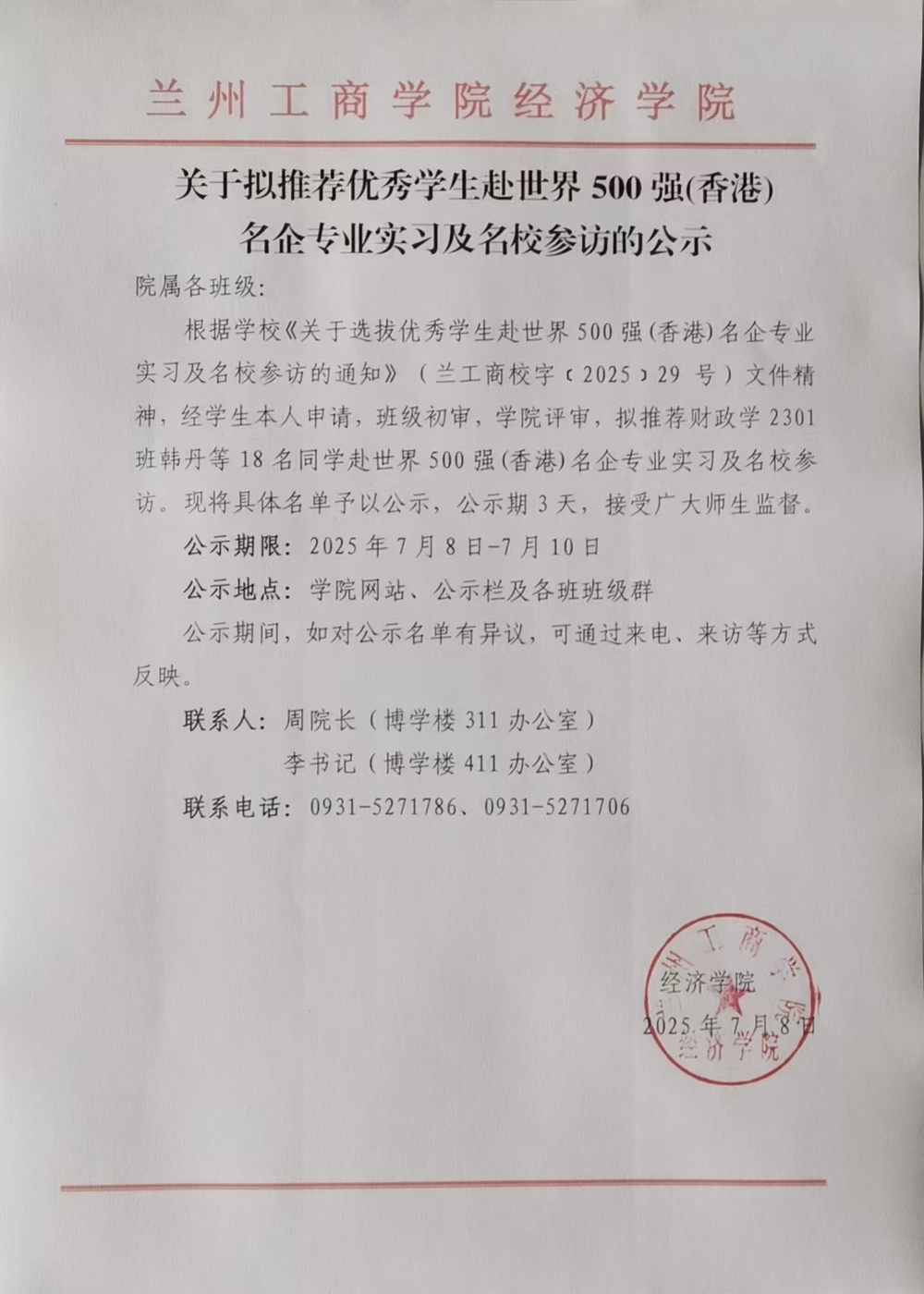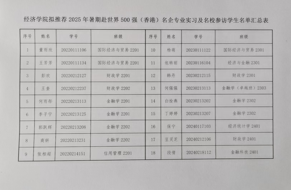关于拟推荐优秀学生赴世界500强(香港)名企专业实习及名校参访的公示
