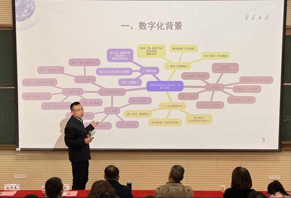 甘肃农业大学柴洪副教授聚焦“翻转课堂在金融学教学中的本土化实践与反思”,系统阐述如何实现“知识传递的课前化”与“知识内化的课堂化”,分享强调教学理念需实现从“以教师为中心”向“以学生为中心,教师为主导”的根本转变,指出数字化教学环境为翻转课堂实施提供重要支撑,通过构建包含课前引导、课中启发、课后拓展与教学反思的闭环教学流程,为翻转课堂的本土化应用提供了实践路径。