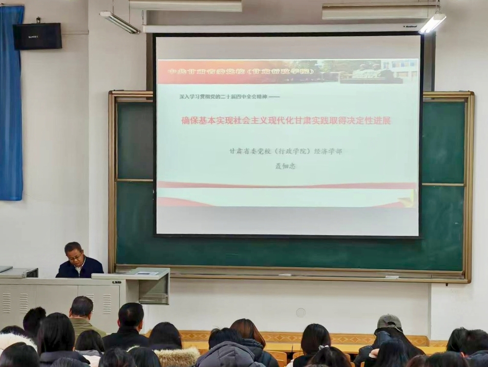 为深入学习贯彻党的二十届四中全会精神,准确把握全会提出的新思想、新论断、新部署,切实把思想和行动统一到党中央决策部署上来,经济学院于2025年12月11日,在实验楼109教室举办二十届四中全会精神专题学习会。本次学习会特邀甘肃省委党校(行政学院)经济学部聂佃忠教授主讲,学院全体师生代表参与学习,深入推动全会精神与甘肃现代化实践深度融合。
