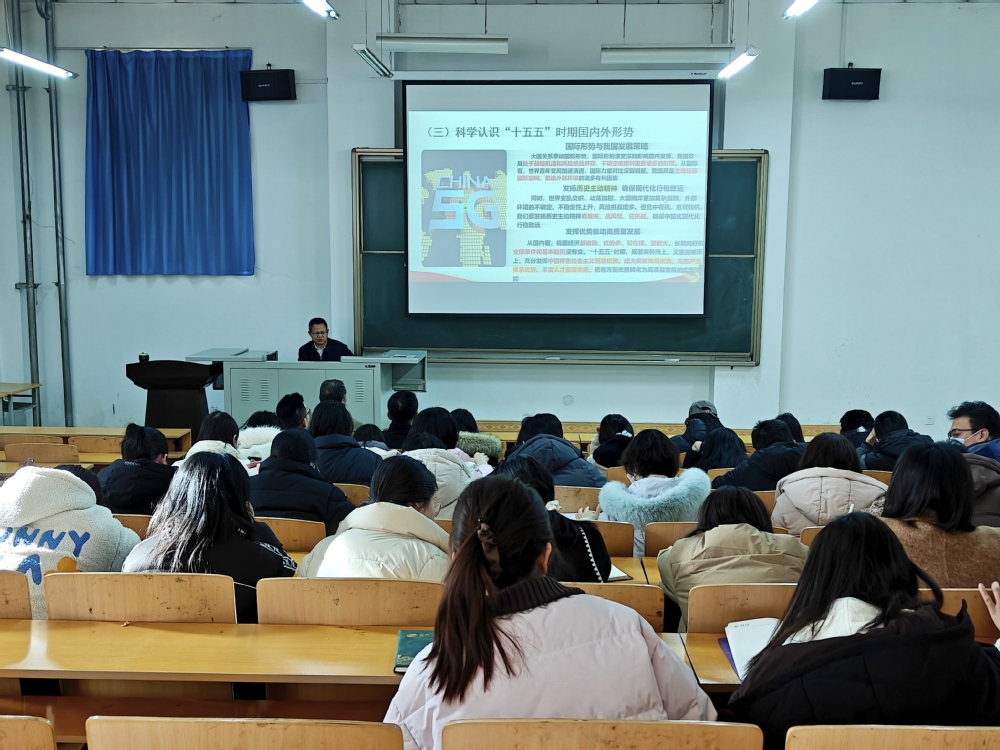 活动伊始,聂佃忠教授以《“十五五”规划建议》起草过程为切入点,结合党治国理政的历史经验,系统讲解了规划制定的背景与逻辑,让师生直观感知五年规划的科学性与战略性,他从国家现代化进程全局出发,深入剖析“十五五”时期的关键地位,点明这一阶段既是国家向基本实现社会主义现代化迈进的重要窗口期,也是甘肃抢抓发展机遇的关键阶段。紧接着,聂教授围绕“十五五”时期经济社会发展的指导方针和主要目标展开解读,结合江金权同志在全会新闻发布会的讲话,清晰阐释“两个需要”的政治内涵与“三个需要”的现实意义,为师生搭建起清晰的理论认知框架。最后,聂教授聚焦“十五五”战略任务与重大举措,解读“全面发力”需以“五位一体”总体布局和“四个全面”战略布局为统领,并强调党的领导是推进中国式现代化甘肃实践的根本保障。讲座中,聂教授以案例释理论、以通俗解深刻,师生们专注聆听、认真记录,现场学习氛围浓厚。