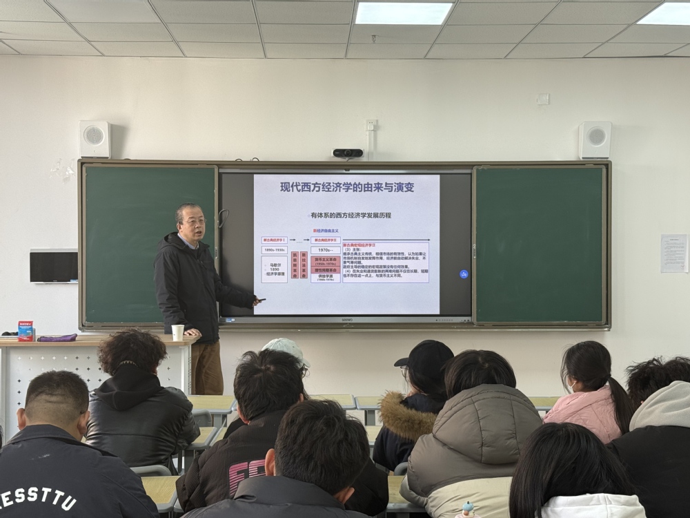 系列活动中,西北师范大学管理学院王恒玉副教授以西方经济学发展脉络为主线开讲,先梳理古典经济学演进历程,重点解析马尔萨斯人口理论的理论价值,再通过直观图表呈现现代西方经济学流派演变,深入解读新古典经济学、新古典综合派等核心学派观点,帮助学生构建完整的西方经济学知识框架,形成系统化认知,强化专业理论储备能力。