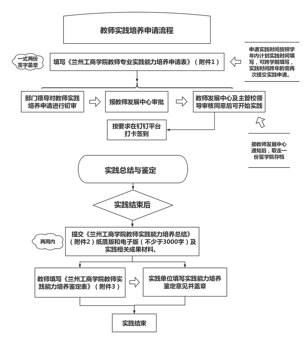 具体内容请查看《兰州工商学院关于加强教师专业实践能力培养的实施意见(修订)》(兰工商校发〔2022〕270号)文件要求,具体申请流程如下图所示: