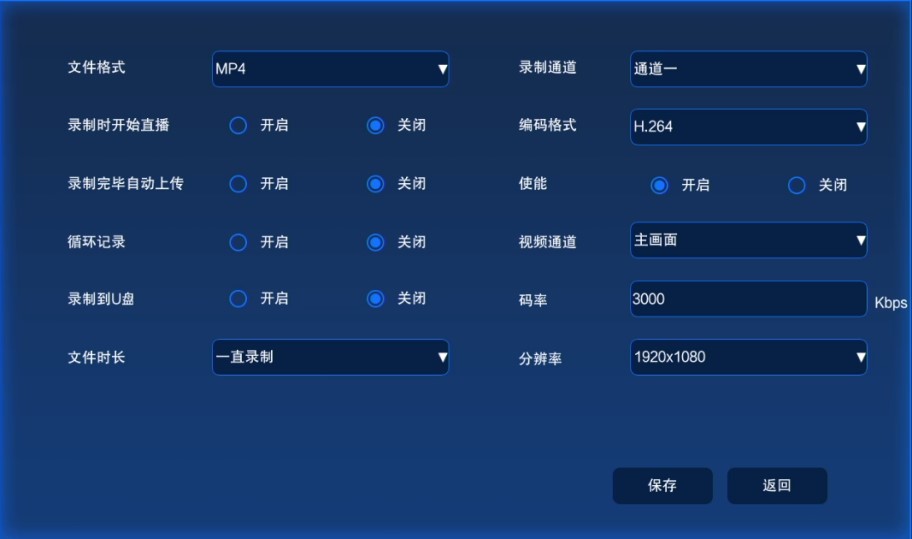 2.可以选择录制通道,最多可以录制三路视频,点击编码格式可更改当前编码格式,可以通过使能开启或关闭。