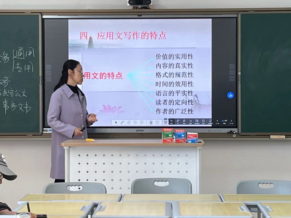 教学观摩活动中,大学语文综合教研室常瑜老师进行了《应用文写作》课程“应用文的特点”相关内容的教学展示,常老师着重讲解了应用文文体实用性、真实性的特点,对应用文文体与文学性文体进行对比讲解,突出应用文解决现实问题、化解实践困境的实用性。授课过程中常瑜老师引入文化典故、文学知识等内容提升课堂的灵活性与趣味性。在讲解应用文真实性特点的内容中,常老师结合所教授班级的专业性特点,引入现实事例,直观深刻地阐明了应用文拒绝任何夸张、想象、虚构成分的存在,确保其真实性与严谨性,将理论知识与生活实际、工作实践相联系,使得知识讲解言之有物,引人入胜。