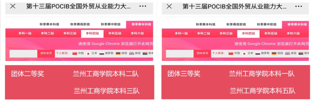 经过13天的激烈比赛,大赛于4月19日圆满结束。我校王红娟老师和赵芳老师指导的兰州工商学院本科二队、三队20名同学荣获团体二等奖的好成绩,王俊老师指导的兰州工商学院本科一队、五队20名同学荣获团体三等奖。