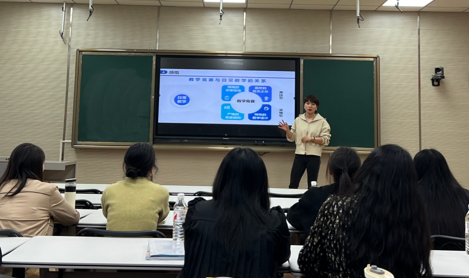活动中,张蓉老师就“全国高校外语教学大赛”进行了参赛经验分享。她在分享中强调,教学比赛的课程设计应做到各个教学要点相结合,始终坚持“以学生为中心”的教学理念,并在教学过程中充分体现。