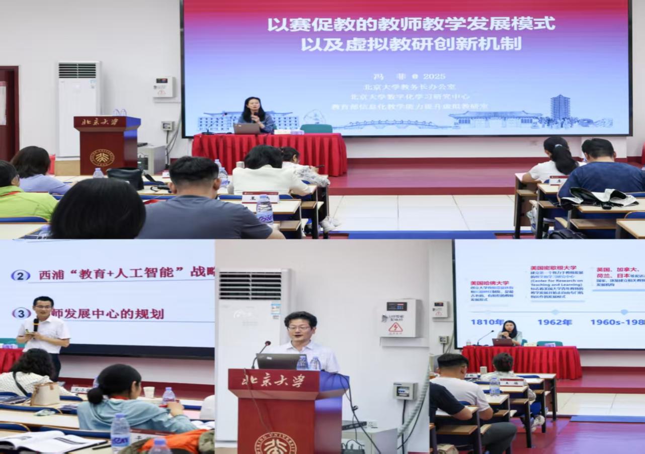 本次研修营紧扣时代脉搏,聚焦人工智能赋能教师发展的重大议题。北京大学孙华教授做了“数智时代的教师教学发展中心建设”专题报告,北京航空航天大学杜洋教授分享了“以名师培育为牵引的教师教学能力提升体系与‘十五五’教师发展”的北航实践,西交利物浦大学张晓军教授为我们带来“教育+人工智能”战略与教发支持的前沿方案,北京大学冯菲教授深入剖析“以赛促教的教师教学发展模式以及虚拟教研创新机制”,北京理工大学张笈教授带我们探讨了“人工智能赋能教育改革与‘十五五’高校教师发展”的关键路径。学习结束后,我校代表教师实地参访了北京大学教师教学发展中心并通过座谈深入学习北京大学在教师教学发展工作方面的宝贵经验,特别是其在教学数字化、智能化转型中的探索实践与成效,对我校教师发展中心规划未来教师智慧教学能力提升具有重要指导意义。