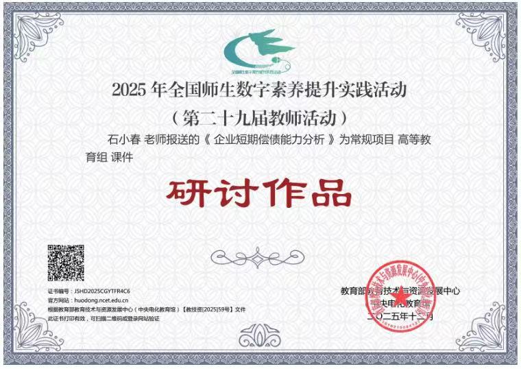 近日,教育部教育技术与资源发展中心(中央电化教育馆)公布了全国师生数字素养提升实践活动获奖结果。我校会计学院石小春讲师报送的《企业短期偿债能力分析》课件作品,在全国高等教育组792件常规项目作品中脱颖而出,成功获评“研讨作品”。据悉,本次甘肃省本科高校在该组别共有16件作品入选,其中课件类作品仅2件,我校石小春老师凭借其精心设计、内容扎实的参赛作品,成功占据一席。这是我校教师作品首次在该项国家级活动中获奖。