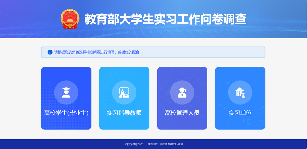 2.问卷填写:请各实习单位推荐1名管理人员及1名担任过指导教师的专业人员分别填写问卷,每家实习单位只需填写一次问卷(即管理人员和指导教师各1份)。
