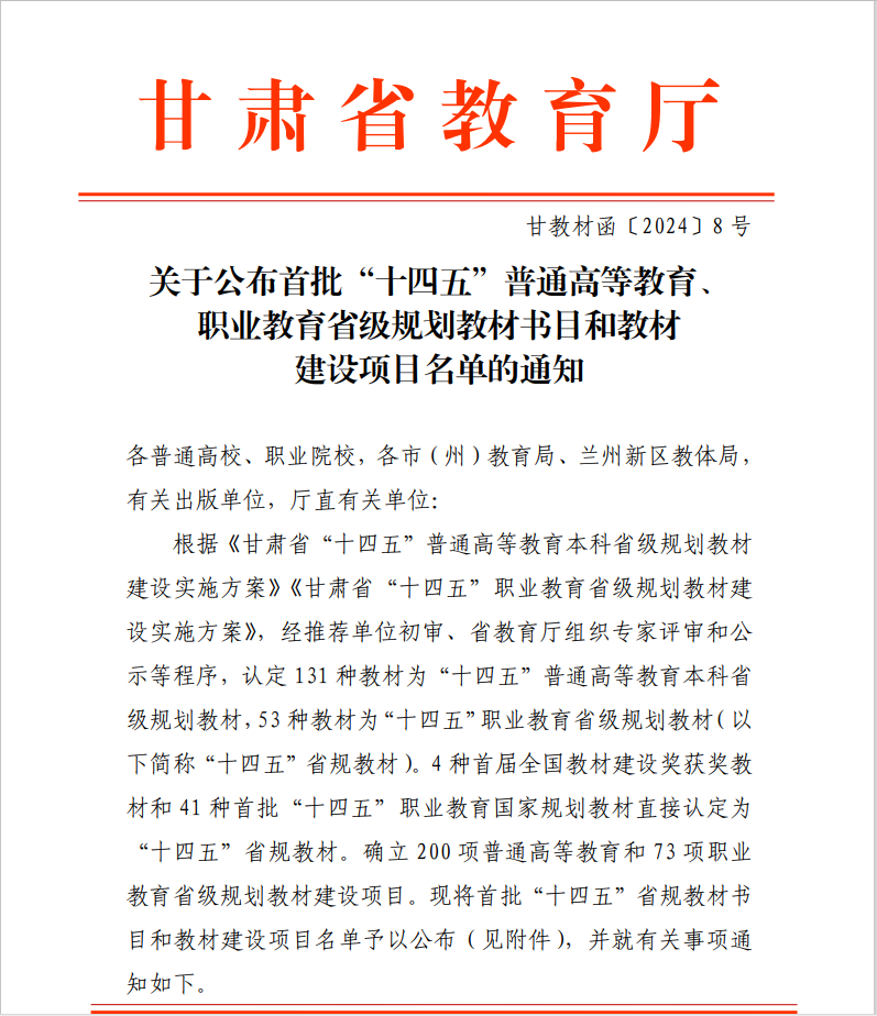 近日,甘肃省教育厅公布了首批“十四五”普通高等教育本科省级规划教材书目,我校许明教师申报的《创新思维与创业实践——商科虚拟仿真综合实训教程》认定为省级规划教材。同时,我校是省内唯一有教材入选的民办本科高校。