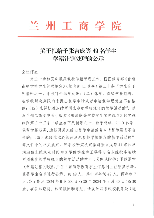 关于拟给予张吉成等49名学生学籍注销处理的公示