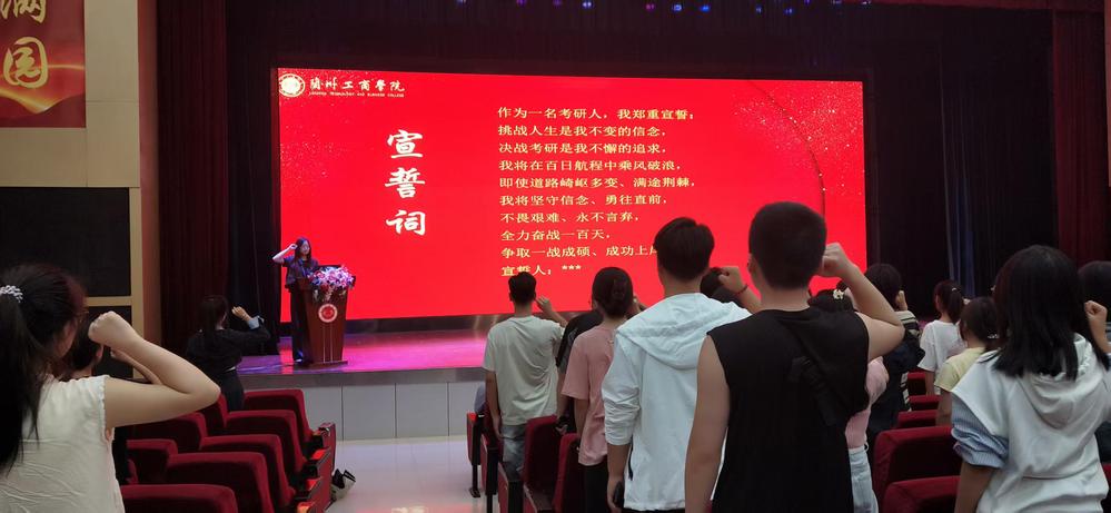 在宣誓环节,经济学院学生曹恬欣带领全体考研学生庄严宣誓:“挑战人生是我不变的信念,决战考研是我不懈的追求……全力奋战一百天,争取一战成硕、成功上岸!”誓言铿锵,展现了学子们决战考研的坚定信念。