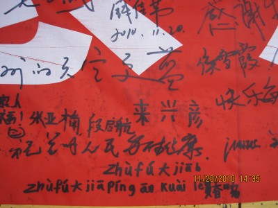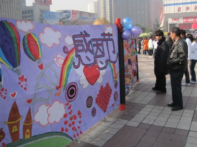此次“感恩,我们一直在心动”系列活动分为两部分:第一部分,2010年11月20日和11月25日分别在兰州地标性建筑——东方红广场和校园内食堂门前广场上进行签名及画轴图片展。活动以画轴为主线,由同学们手工制作的感恩卡片和感恩美文组成并配以感恩图片生动、形象、立体的向广大市民及师生展示了当代年轻大学生的感恩之心与感恩之行。活动中同学们不畏严寒热情的向大家介绍此次活动的由来及目的并邀请路人与师生签名并写下自己的感恩宣言,同学们用自己的热情为寒冷的冬日送去了一份暖意