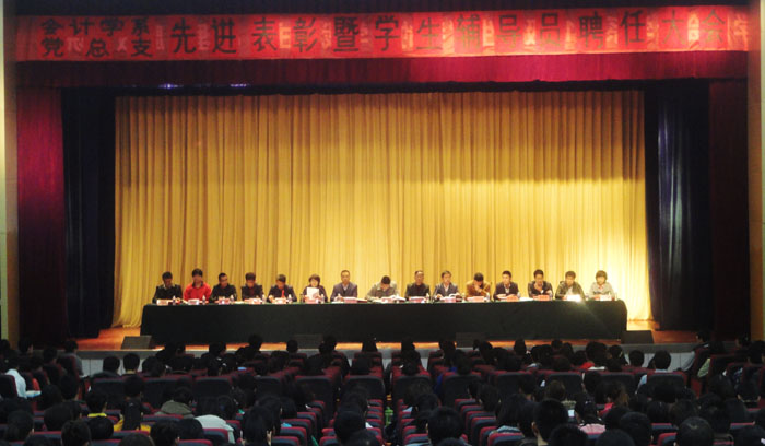 会上,党委工作部副部长尚飞同志宣读了学院党委《关于<关于调整会计学系党总支委员及所属支部书记的报告>的批复》;王娜娜同志宣读了《关于表彰优秀党务工作者、优秀学生辅导员和优秀共产党员的决定》;李号龙同志宣读了《关于聘任冯丽丽等14名学生担任2011级学生辅导员的决定》;党总支秘书王增峰同志宣读了《关于雷娟等同志党内职务任免的决定》。主席台就坐领导为获奖个人颁发了证书和奖品。杨怀有书记为新聘任2011级学生辅导员颁发聘书。