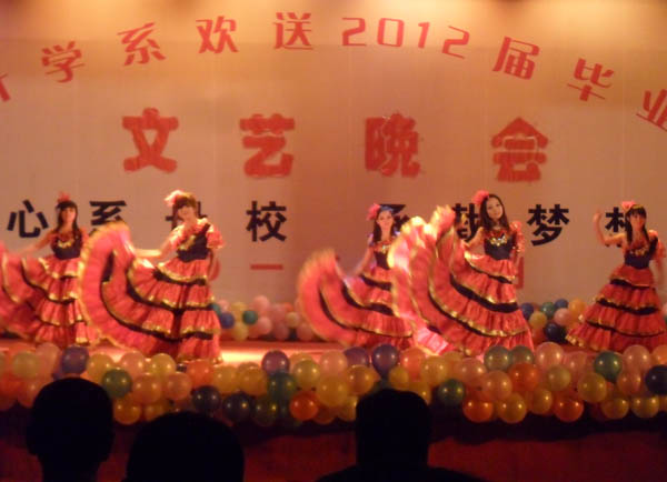晚会上,由2011级学生表演的歌舞剧《再见那些年》、歌曲串烧《青春纪念册》展现出我系学生深沉厚重的情感和学院、在校师生对即将走上新征程的学生的殷切期望;由我系学生会文艺部同学原创并倾情演出的歌伴舞《加油,去宇宙》、舞蹈《印度风情》等节目,表现了我校学生勇敢追逐梦想、坚持不懈的拼搏精神;相声《告别母校—陇桥》、朗诵《追忆飞翔》、情景剧《毕业照》等节目更是将整场晚会推向了高潮,让观众们经历了从狂欢到伤感、从共同欢乐到依依惜别的情绪变化,一同挥洒了属于毕业的欢笑悲伤,并为毕业生送上了真挚的祝福。