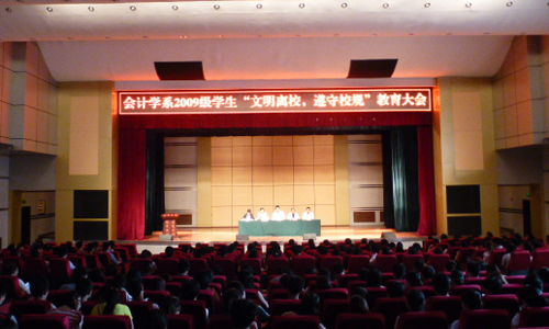 5月24日下午,我系在学术报告厅召开“会计学系2009级毕业生“文明离校,遵守校规”教育大会。会计学系主任李菊香,系党总支书记马义哈,原系党总支书记杨怀有,系党总支副书记、行政副主任张春燕,系党务秘书、毕业班辅导员王增峰等同志出席了本次大会。我系2009级毕业生600余人参加了本次大会。
