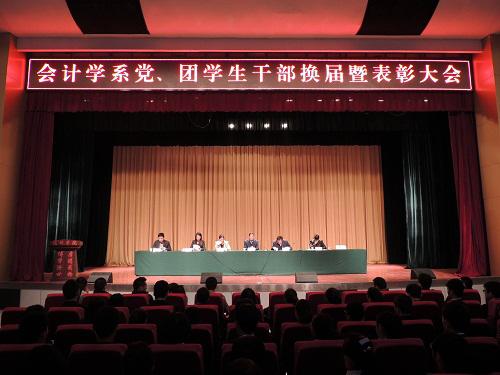 2013年10月25日下午,会计学系在学术报告厅召开了会计学系党、团学生干部换届暨表彰大会,与会领导包括学院副院长兼会计学系党总支书记杨培权,学生处处长、团委书记张计强,系主任李菊香,系教学副主任张春燕,系党总支副书记刘海娟,系团总支书记晋如意;参会人员包括我系辅导员、学生干部,以及700余名学生代表。