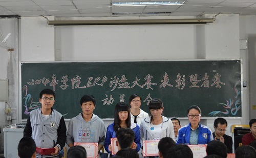 会上李菊香主任宣读了我系学生在学院ERP沙盘大赛中的获奖情况。表彰大会第一项是由ERP社团学生代表介绍ERP的活动内容,并针对2013年度社团工作进行总结回顾,引发了同学们的浓厚兴趣。随后,系领导分别为本次学院举办的ERP大赛中取得优秀成绩的同学们进行表彰并颁发荣誉证书。紧接着,李菊香主任勉励即将参加省赛的各位同学们,要总结经验,发奋学习,争取更高的荣誉。最后,杨院长对获奖选手表示祝贺的同时,寄希望通过参加省赛提高同学们的团队精神,使教学质量,教学水平不断提高,引导全体同学积极参加各项专业技能大赛,真正达到以赛促教,以赛促学。