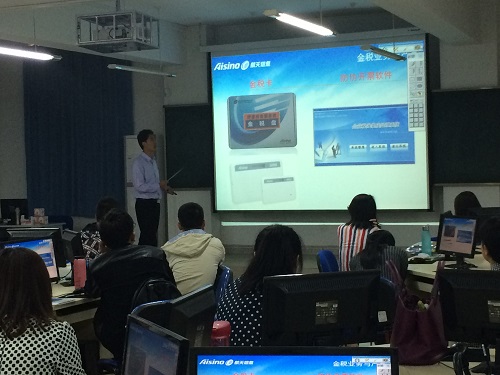 5月18日,我系特别邀请了航天信息股份有限公司甘肃分公司培训部的资深讲师走进大三年级《会计综合实验》的课堂,就电子防伪税控系统在企业会计工作中重要作用与涉税应用给同学们做了详细介绍与演示。整堂课在轻松、愉悦、热烈的氛围中进行,无论是学生在练习环节的积极参与,面对问题时与讲师主动的沟通,还是同学之间热烈的争辩,都使得学习过程变成了充满乐趣的认知体验。