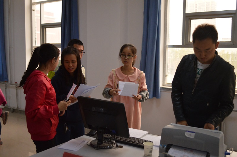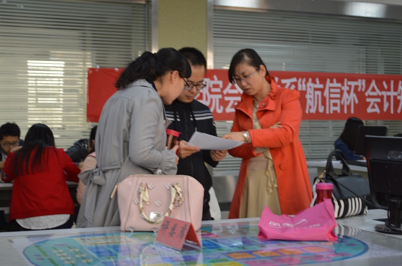 4月20日下午,“航信杯”第四届会计知识竞赛复赛——财税技能实务赛在实验楼ERP决策实验室成功举办。本次比赛是现场会计手工模拟多人多岗财税技能竞赛,初赛胜出的24名选手通过抽签组成了六支代表队,每队分别由2名大二和2名大三的同学组成。下午2:30,赛场总裁判邢志彬老师宣读了竞赛流程和注意事项,李菊香主任宣布比赛正式开始。各代表队分工合作、充分发挥专业技能、争分夺秒,从填制记账凭证、涉税业务处理、编制财务报表三方面展开了激烈的竞争。150分钟的比赛紧张而激烈,甘肃航天信息公司的霍鹏老师作为现场涉税业务裁判同时扮演税务局的角色,协助同学们利用增值税防伪税控系统开具增值税发票办理涉税业务。