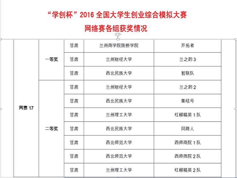 2016年6月3日上午,会计学系“超活力”、“开拓者”两支队伍代表学院在实验楼408机房参加了2016年“学创杯”全国大学生创业综合模拟大赛甘肃赛区比赛。本次省赛采用“创业之星”软件作为竞赛平台模拟企业经营四个季度,每季度经营时间为一小时,共有来自全省各高校的17支队伍通过网络竞赛形式参加了本次比赛。经过紧张而激烈地竞争后,由我系丁进涛、孙苗苗、高丙磊同学组成的“开拓者”队取得了省赛第一名的好成绩,获得甘肃赛区一等奖。
