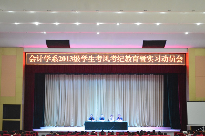 在期末考试和实习工作即将开始之际,7月7日下午,会计学系在学术报告厅召开2013级学生考风考纪教育暨实习动员大会。系领导班子成员、辅导员及2013级全体学生参加本次会议。会议由张计强副书记主持。
