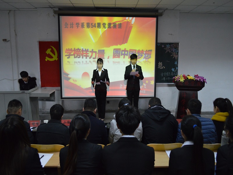 12月14日下午,会计学系党总支在博学楼215教室举办以“学榜样力量,圆中国梦想”为主题的党课演讲比赛。会计学系党总支书记、副书记、委员、学生党员以及54期全体入党积极分子参加了比赛活动。