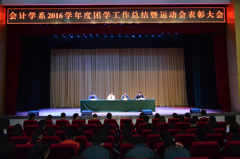 5月25日,会计学系2016学年度团学工作总结暨运动会表彰大会在学术报告厅召开。系领导班子成员及800余名学生代表参加。大会由系党总支副书记张计强主持。