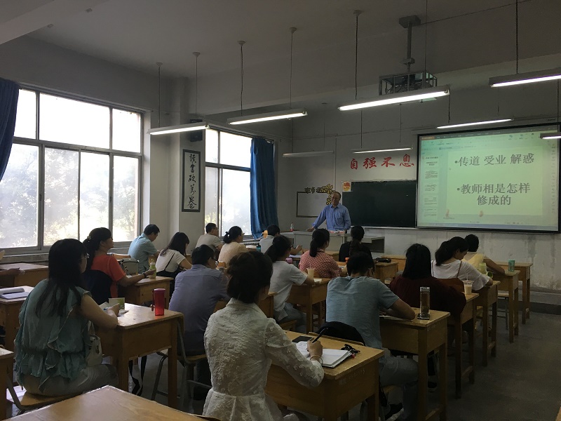 袁老师以演奏音乐需要调音准、掌握好节奏为例,指出无论是领导还是普通老师,都应该找好自己的位置并干好本职工作,再向传道、授业、解惑的目标努力。故人云“君子三乐”,“得天下英才而育之”就是其中一乐,所以作为老师我们应新心存感念、热爱教师这个行业。袁老师讲到关注学生安全是教师的第一道义,辅导员老师应深入学生的内心、关心其生活,专职老师在授课时应给学生传递正确的世界观、人生观和价值观,从帮学生而建立正确的财富观、引导学生树立高雅的审美情趣。其次,袁老师以曾国藩、胡适、诸葛亮等人注重形象和品德修养为例,指出教师要有教师相,注意自己平时的言行并严格要求自己。最后,袁老师讲到“学然后知不足,教然后知困”,强调读书是教师的终身使命,同时要对学生存有敬畏之心,不能对学生存分别心,这是对学生的尊重和负责。