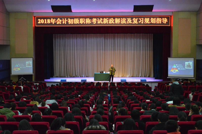 为不断提升会计学系学生对会计初级职称考试政策改革的认知,更好地复习备考会计初级职称考试,12月5日下午我系于学术报告厅举行了“2018年会计初级职称考试新政解读及复习规划指导”讲座,主讲嘉宾中华会计网校赵玉宝老师向参加讲座的2015、2016、2017级的近八百名学生解读会计初级职称考试相关政策。