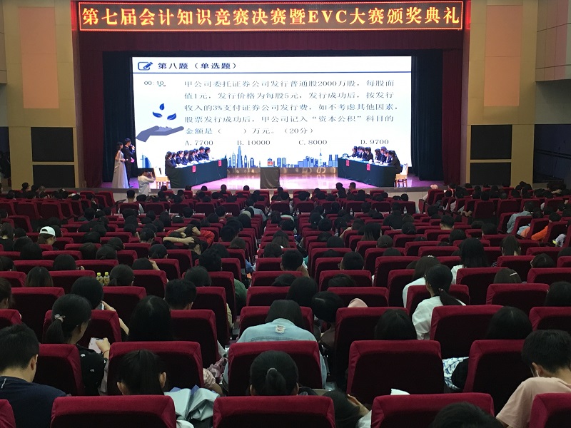 为培养符合新时代中国特色社会主义经济发展需求的财会类人才,营造浓厚的学术氛围并激发广大同学们的学习热情,6月21日下午,我系于学术报告厅举办了“第七届会计知识竞赛决赛暨EVC大赛颁奖典礼”,活动由学院副院长燕宏副教授、学院副院长杨培权院长、学院经济学教学总监樊元教授、学院管理学教学总监王生林教授、学院大学生创新实践中心主任周海燕老师、会计学系主任李菊香副教授、会计学系党总支副书记陆海峰书记、会计学系主任助理李小龙老师、睿晴事务所会计师岳芸、注册会计师袁艳梅出席,2016、2017级近800名同学参加。