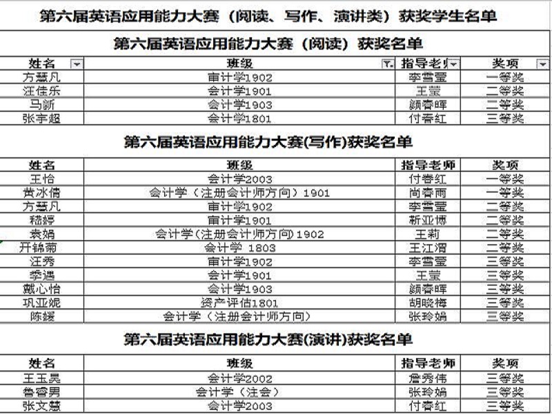 近日,由大学生创新实践中心主办,外国语言文学系承办的第六届英语应用能力大赛落下帷幕。我系参赛队经过认真准备,精心组织,激烈竞争,共有18名学生获奖。其中,一等奖3人,二等奖6人,三等奖9人。
