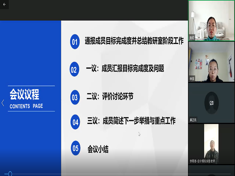 审计学教研室于11月6日下午召开“三议”会议,审计学教研室主任张红教授主持,审计学教研室全体教师和学院全体领导班子参加,此外,学校部分领导和教师发展中心旁听了会议。会议中张红教授梳理了教研室成员的工作目标完成情况以及教研室目标的完成情况;每位教师分别针对个人的目标阐释了完成度以及存在的问题,并提出下一步的工作计划。最后,会计学院院长李菊香做了会议总结。由于审计学教研室“三议”会议组织的规范有序,学校将会议过程录制剪辑成了教研室“三议“会议示例视频。