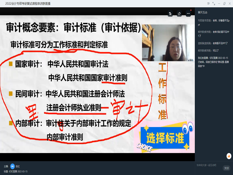 3月15-19日,针对会计专硕考研复试涉及的6门课程,各教研室在寒假期间组织教师完成了课程大纲的撰写,组织了优秀课程主讲教师进行了线上串讲,并梳理出了核心概念、简答以供学生备考。教学总监孔陇教授结合自身多年复试经验,给同学们从专业课复习、问题回答的技巧方法、常见问题进行了梳理总结。