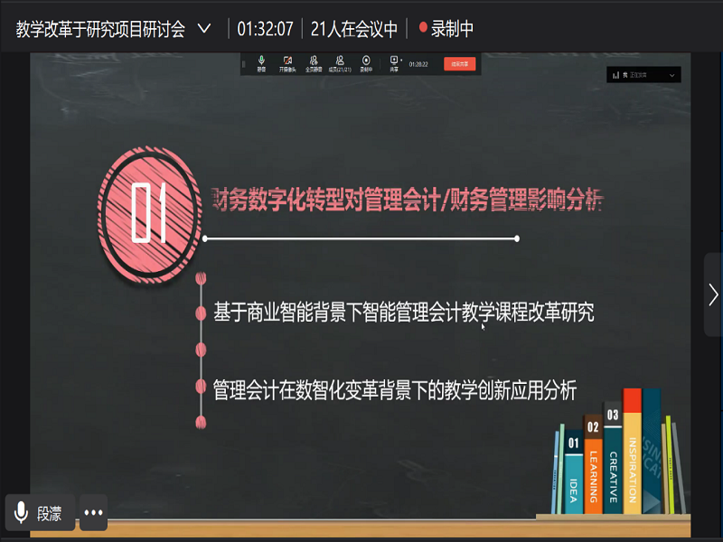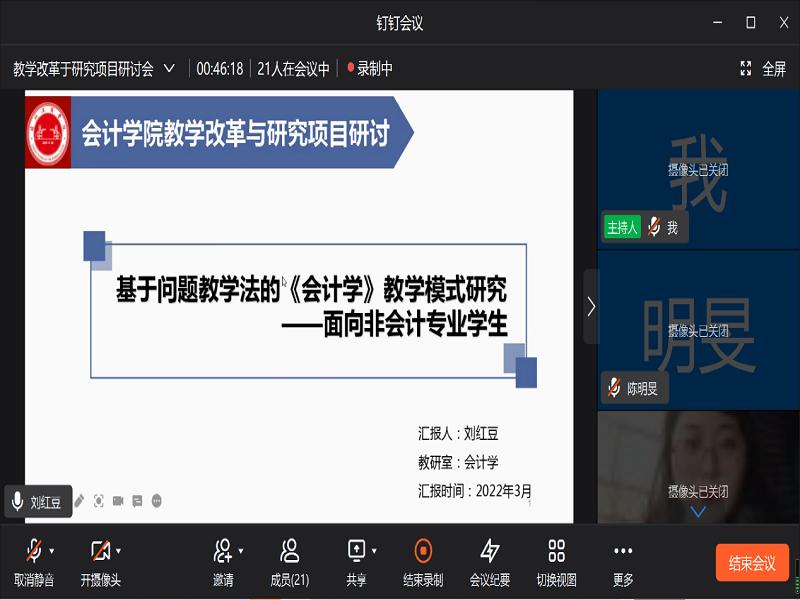 为进一步推进会计学院2022年度教学改革与建设工作,更好地提升专业教学质量,促进学院专业的内涵建设,会计学院于3月24日下午在线上召开全体教师教学改革与研究项目申报研讨会,参加本次研讨会的学院领导有会计学院教学总监孔陇教授、会计学院院长李菊香副教授,以及全体专职教师。会议由院长李菊香副教授主持。