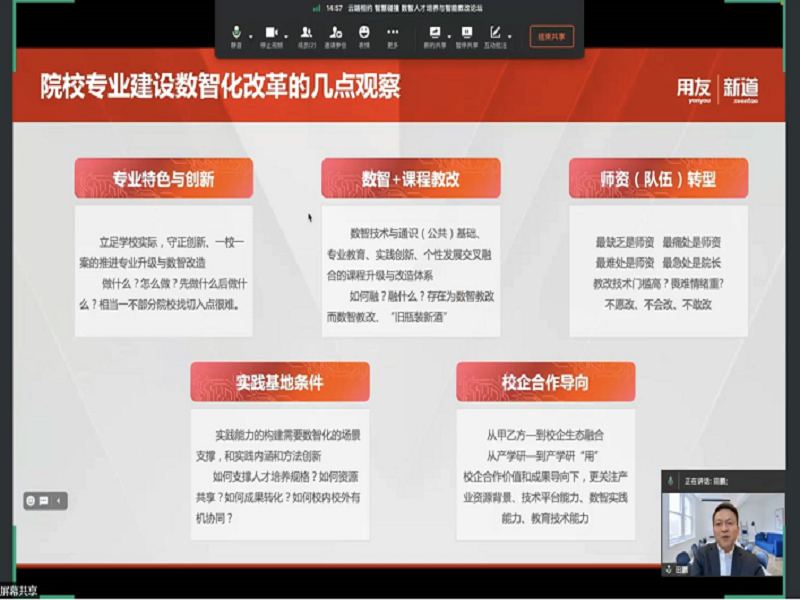 此次线上会议新道科技股份有限公司副总裁田鹏提出了数智化时代的产教融合路径,并发布了2022新道“融+”计划。“融+计划”是用友新道面向合作院校提供的数智人才共育计划。这将是未来数智化教育的有效改革路径。数智化人才培养非一日之功,需要产学协同、校企合作才能不断探索,不断创新,打造数智教育新时代。