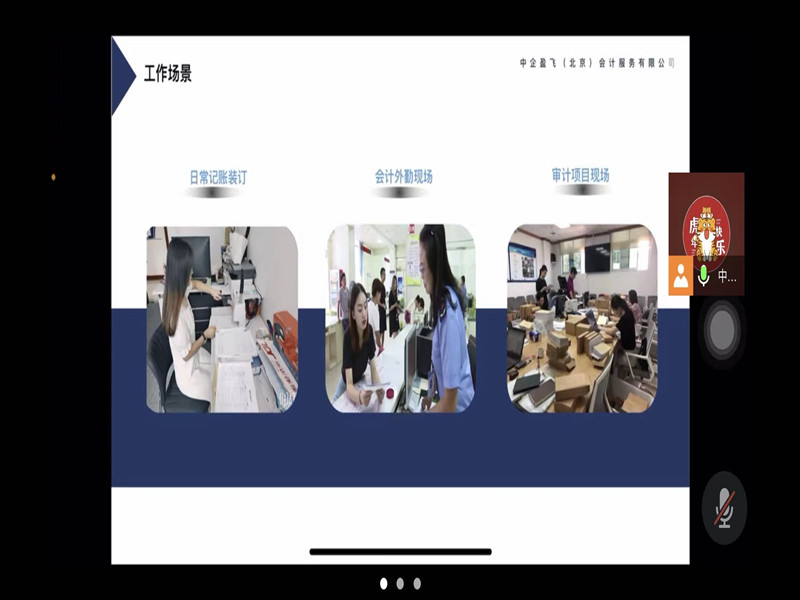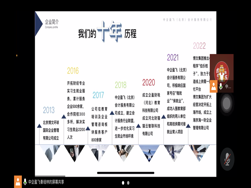 秦培林经理从中企盈飞的企业概况、服务、企业文化、管理机制等几个方面为同学们进行了简要介绍,使得与会人员对中企盈飞(北京)会计服务有限公司的发展历程和工作理念有了初步的了解。随后,又通过PPT讲解了中企盈飞(北京)会计服务有限公司在管理机制等方面的优势以及优良的企业文化。最后,秦培林经理详细介绍了本年度事务所的招聘流程及规模。至此,本场线上招聘宣讲会圆满结束。